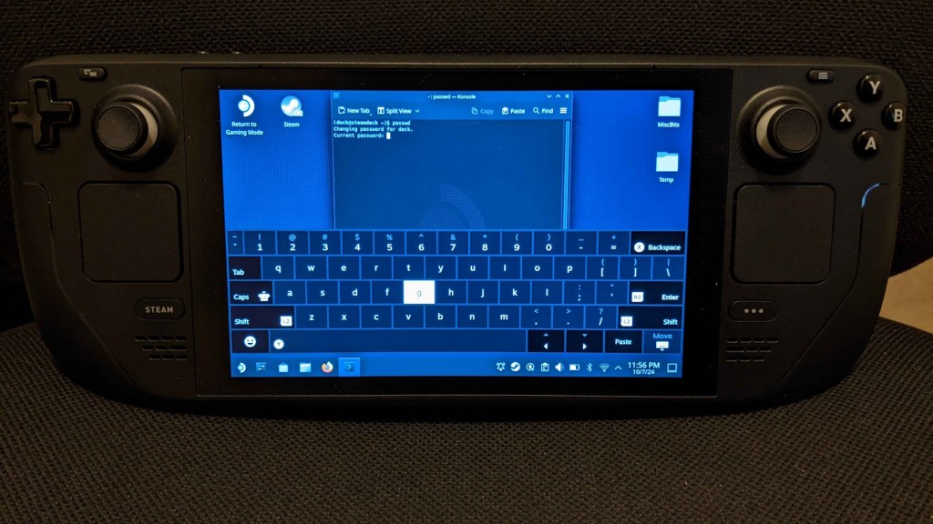 For the first few steps before we have ssh, you’re going to need to be working on-device, either with a bluetooth keyboard plugged in, or using the built-in virtual keyboard that can be brought up by pressing [Steam]+[X]; when I first did this I was using the virtual keyboard.