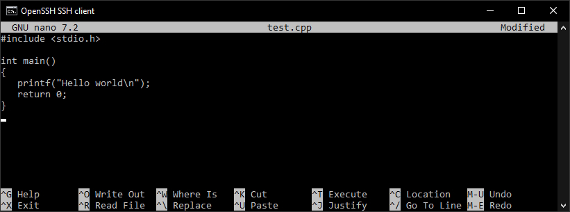 Press Ctrl+O to “Write (O)ut to file” (save) and when it asks you for the filename just leave it as test.cpp and press enter.