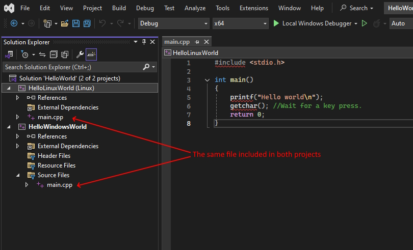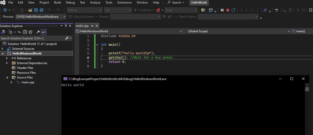 For a quick pre-amble here, as I tend to use this setup to test on both Windows and Linux from a single solution, my starting point here is a “Hello World” program with a Windows project already included that looks like this: