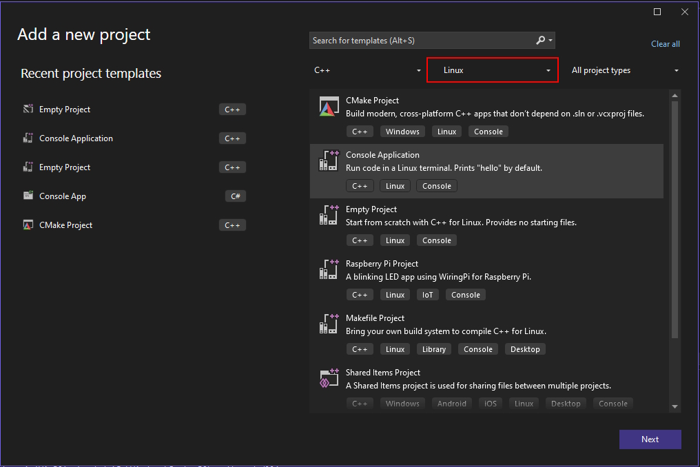We’ll be ‘adding’ a VSLinux project to this solution, but it’s all the same dialogs that you would get when just creating a new project from scratch.