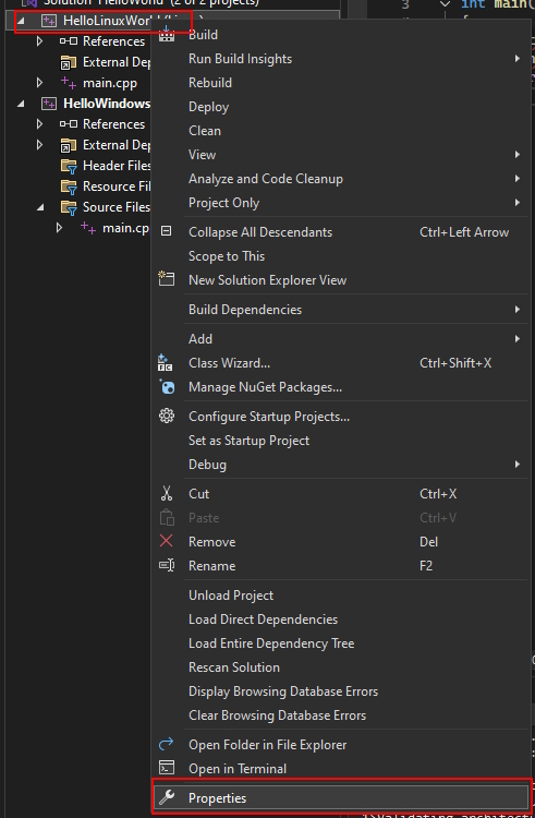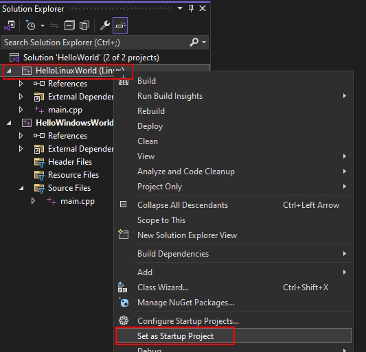 Firstly set the Linux project as your startup project by right clicking on it and selecting ‘Set as Startup Project’: